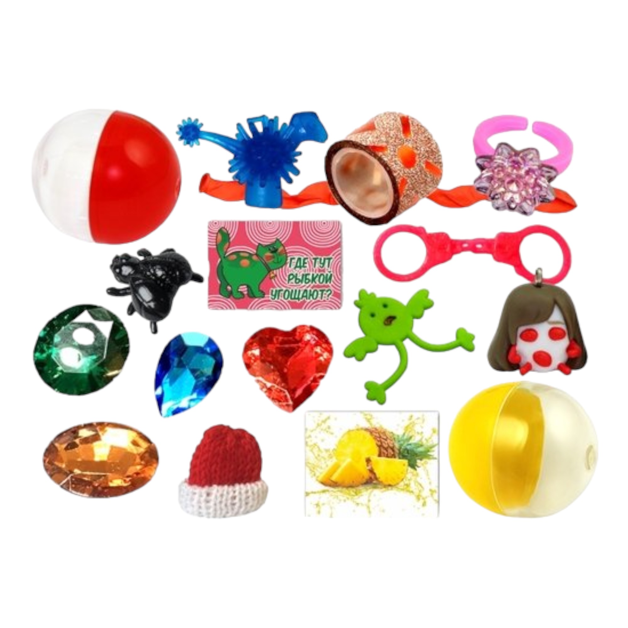 Игрушки упакованные в прозрачные капсулы диаметром 28 мм с цветными крышками 250шт/уп.