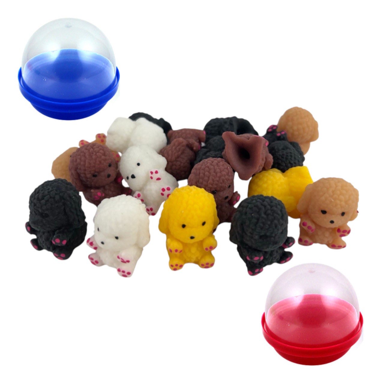 Прикольные милые сквиши "Собачки Пудель" в виде разноцветных пуделей, упакованные в капсулы диаметр 45 мм, с яркими разноцветными крышками.