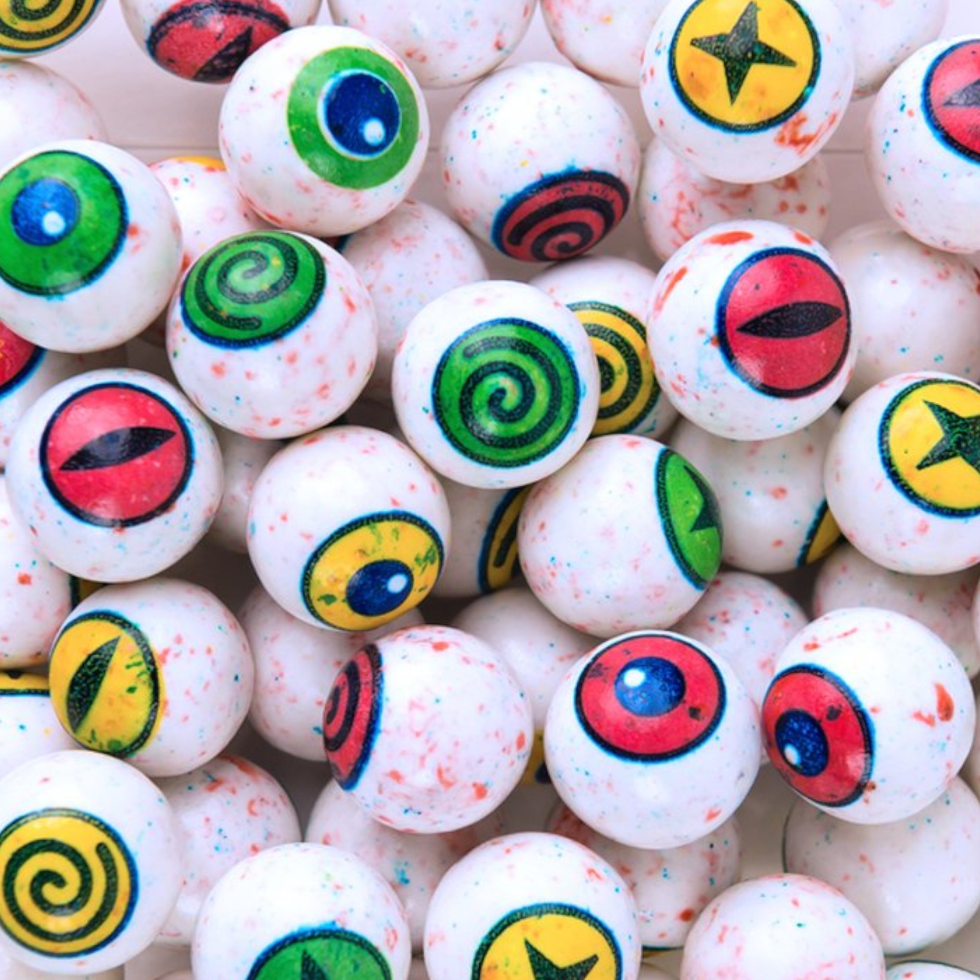 Уникальный дизайн жвачки представляет белые глазные яблоки с кроваво-красными брызгами.