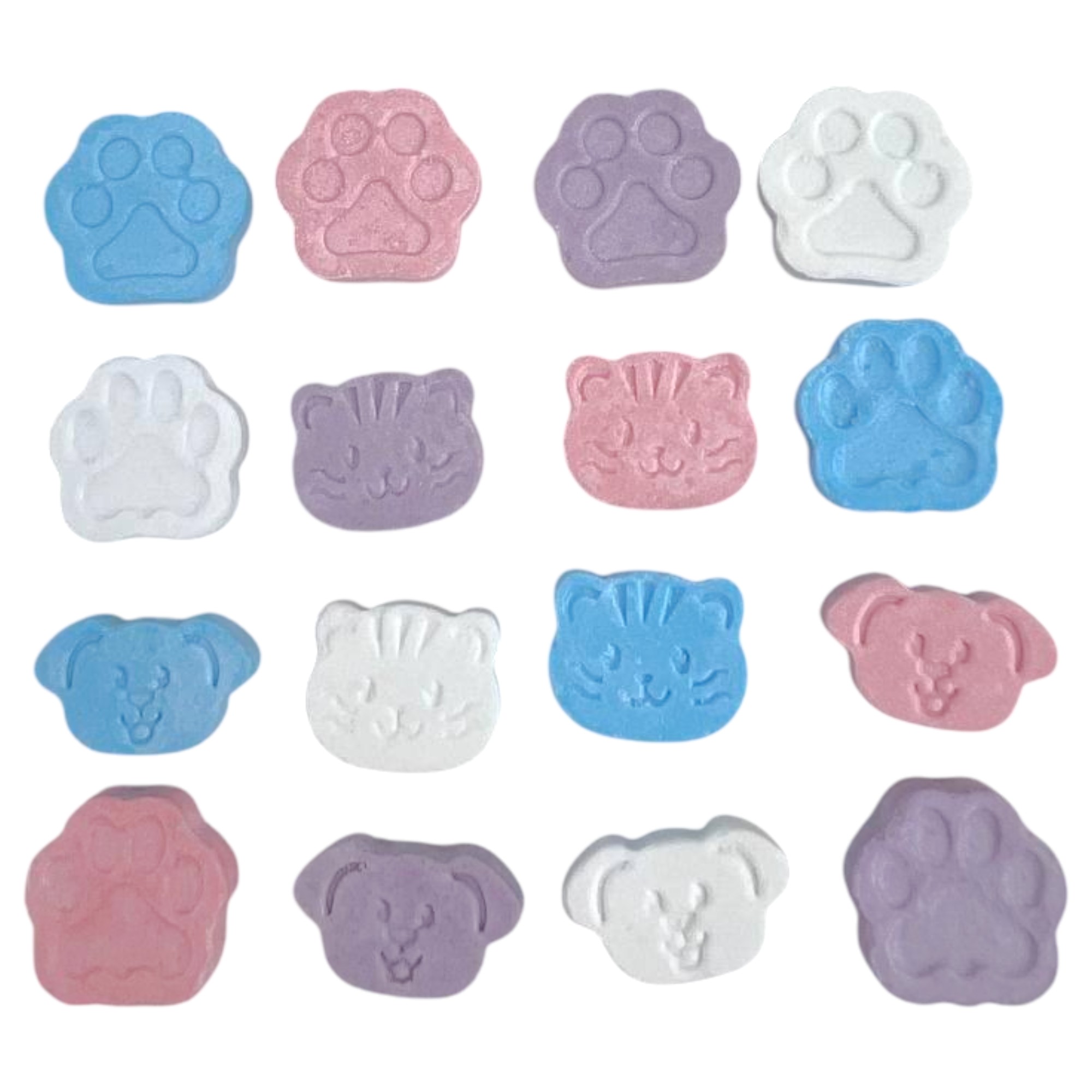 Порционные конфеты драже российского производства RusGum в виде разноцветных кошачьих лапок и мордочек, и собачьих лапок и мордочек.