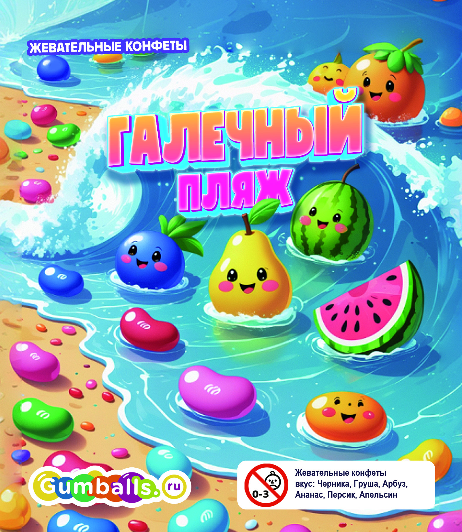 Дисплей с описанием серии жевательных конфет "Галечный пляж" для вкладки в колбу торгового автомата.